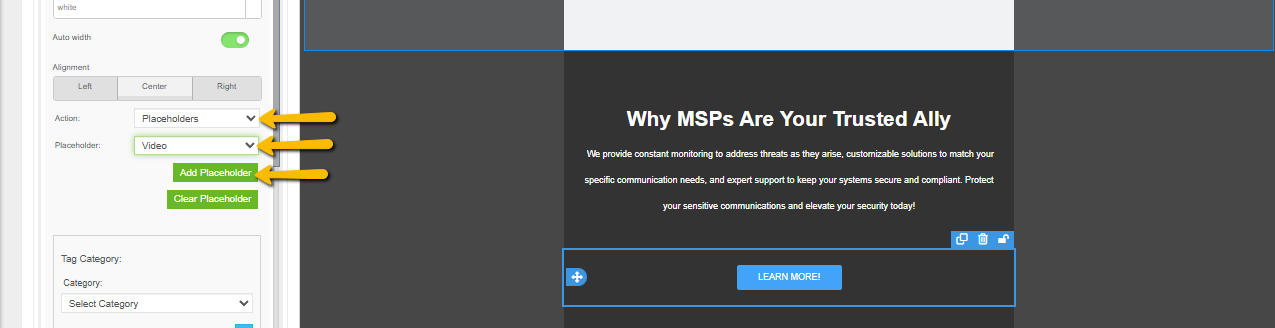 When to use it: Use the Video placeholder when your button action involves video content—such as linking to a hosted video, a walkthrough, or a product demo.