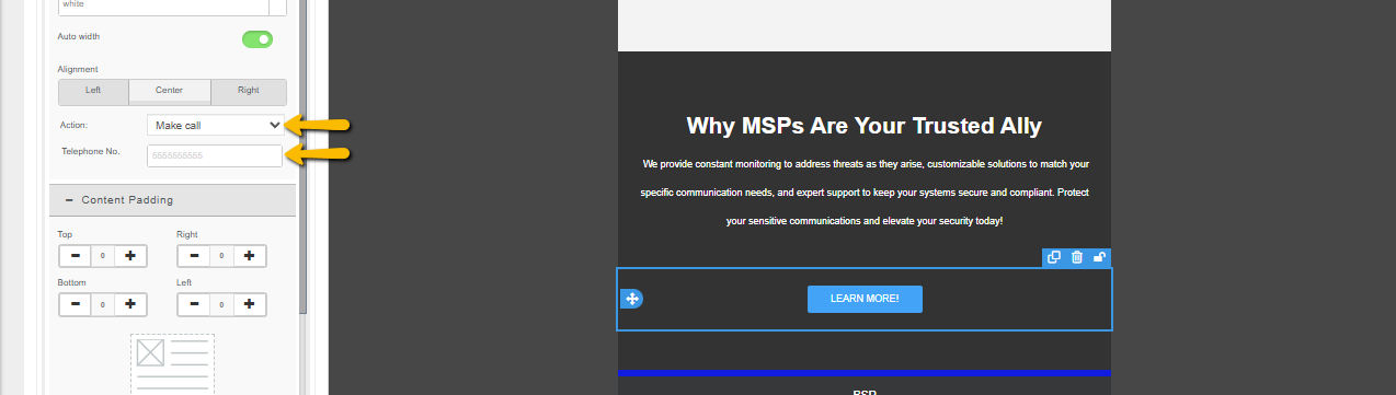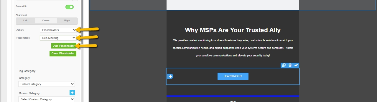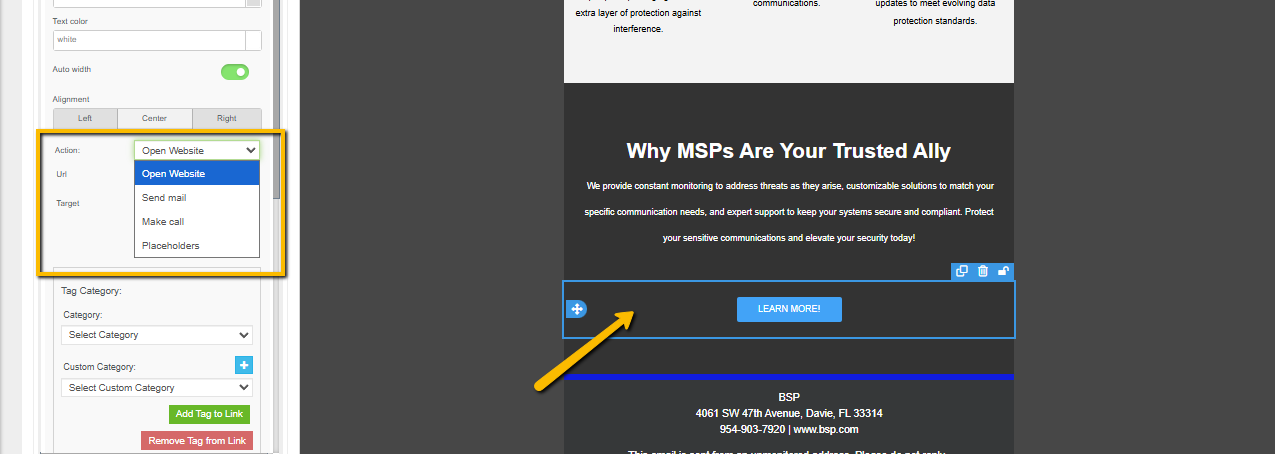 Buttons in the Evolved Office Email Editor can do more than just link to a webpage. You can set them to perform specific actions such as opening a website, sending an email, making a call, or inserting placeholders. This guide walks you through how to use the Action dropdown and its available options.