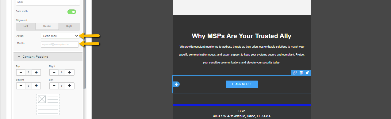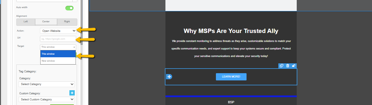 Below are the four button action types available in the Evolved Office Email Editor. Here’s what each action type does and how to configure them.