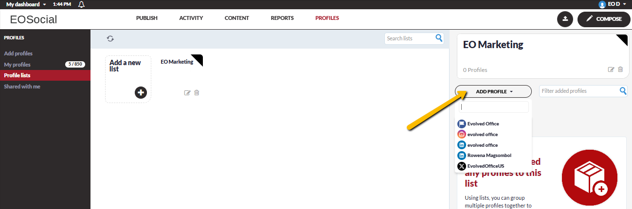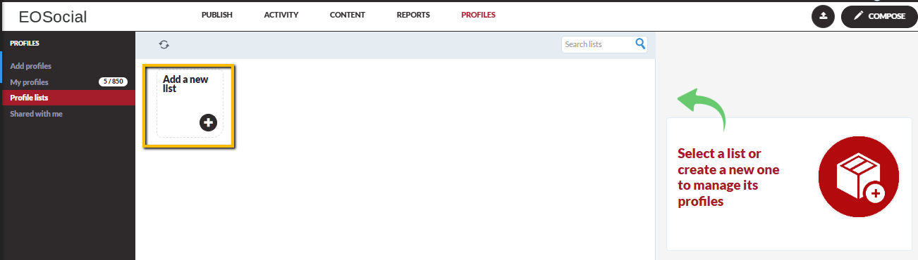 - Once you’ve created the list, click on it and click Add Profiles to start adding profiles to your list.