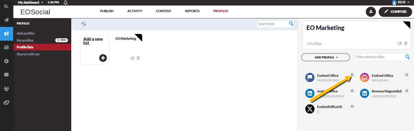 - To delete a profile from a list, click the ‘x’ icon displayed on that profile.