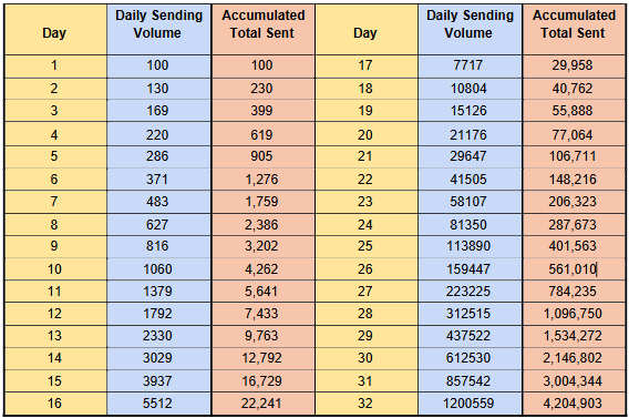 - Sending begins at a low daily volume