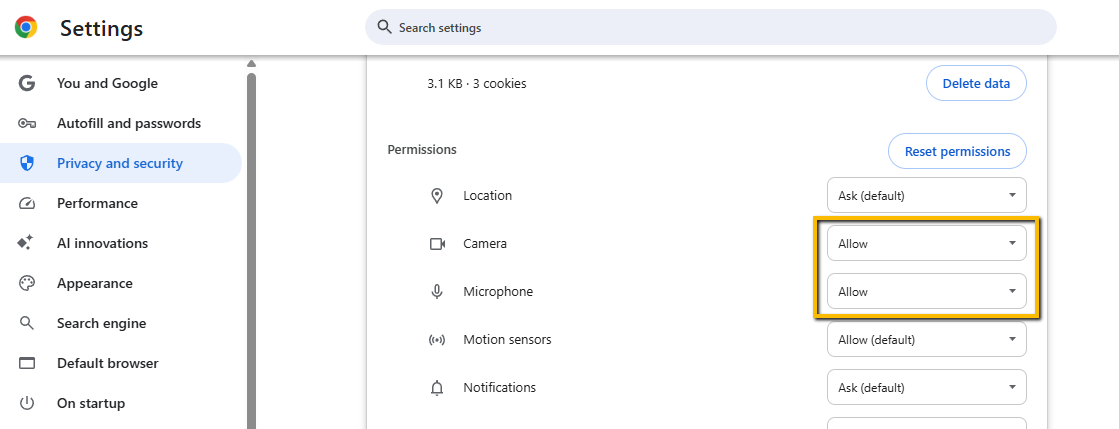 - Go to Settings → Cookies and site permissions → Microphone / Camera