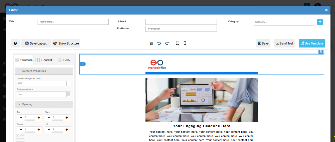 After selecting a layout, you’ll enter the Email Editor.
