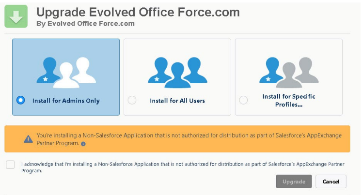 Click Install / Upgrade (this will depend on whether this is a fresh installation of the app or an upgrade to a new version).