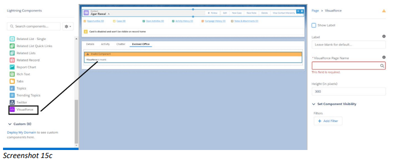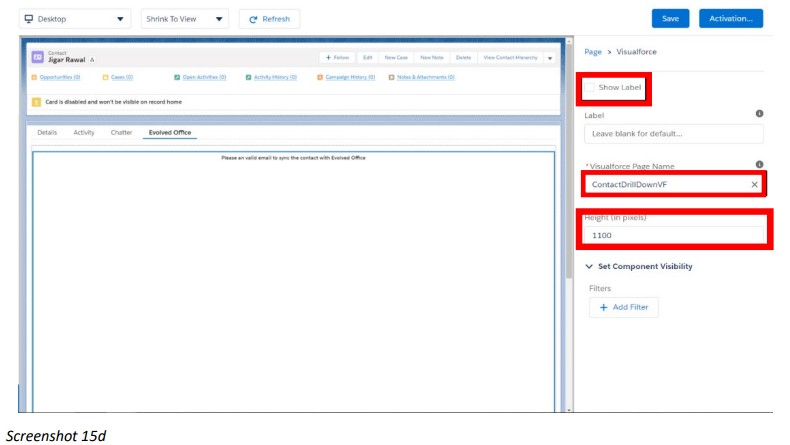 - After dragging the visualforce component in the empty section, click on the component to configure the details for that section. Uncheck the show label checkbox, In the visualforce page name search for ContactDrillDownVF and select it. Keep the height as 1100.