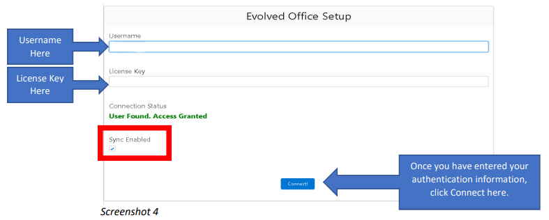 - Add your Username and License Key as provided by the Evolved Office team.
