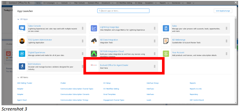 From the left-hand application selection icon (nine dots), choose Evolved Office for Agent Dealer. This will load the application and the related tabs.