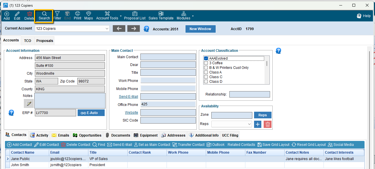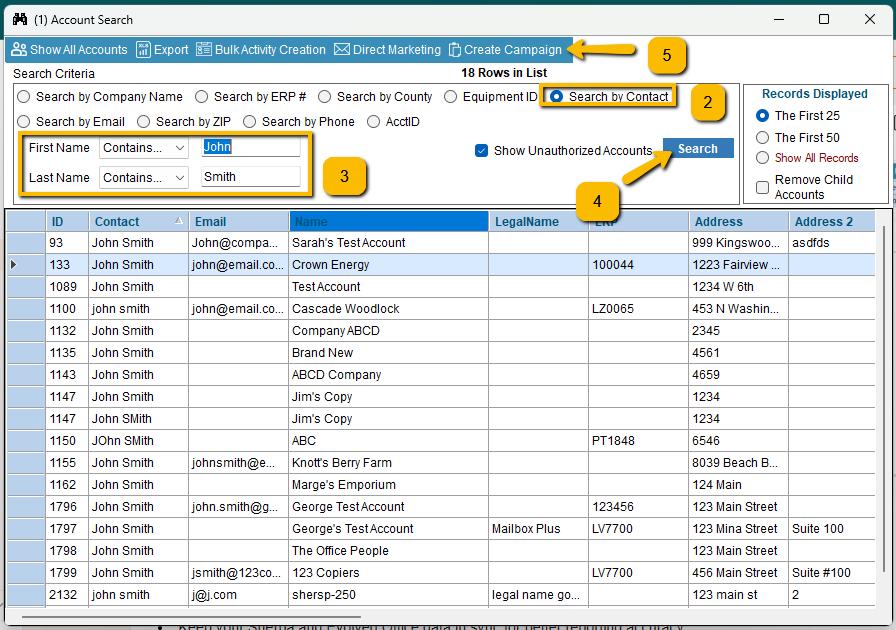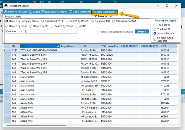 - Choose your search criteria (e.g., Company Name, Contact, Email, Equipment ID, or Zip Code).