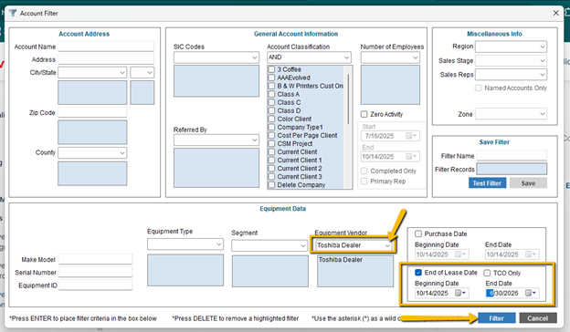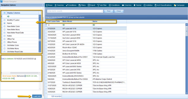 Example: End Lease Date between 10/14/2025 and 6/30/2026 - Click Load Grid to view filtered results.
