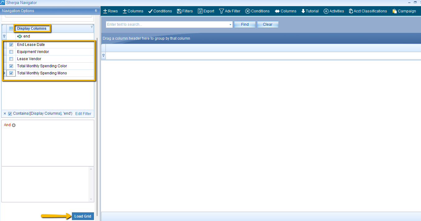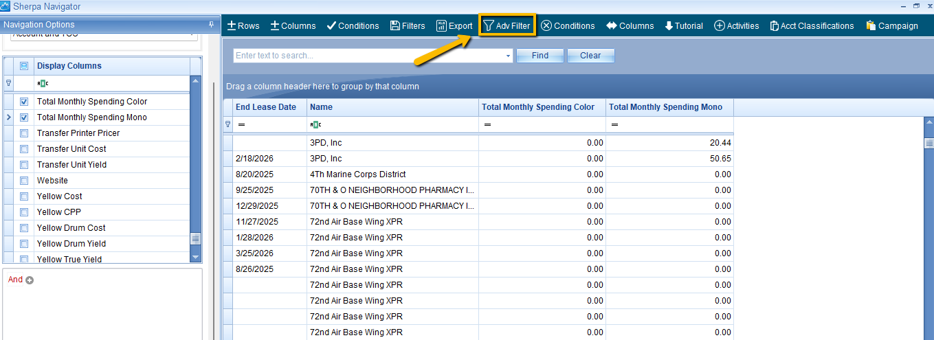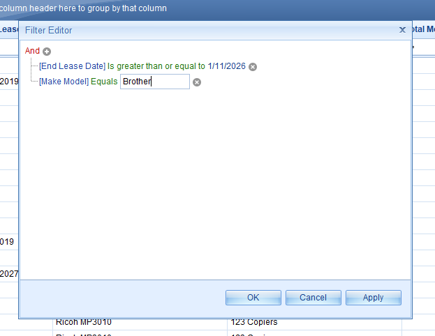 - Example: Filter “End Lease Date” (e.g., in the next 180 days) and “Make Model” (e.g., Brother)