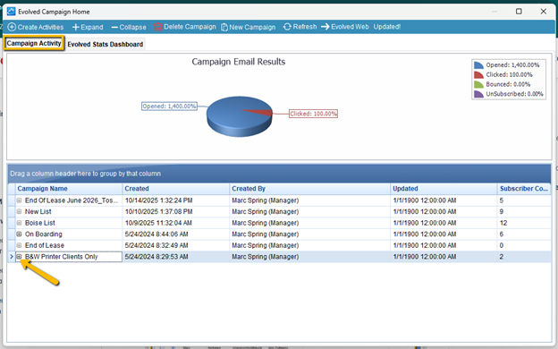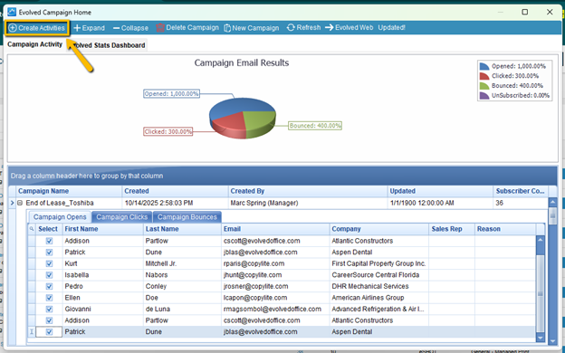Evolved Office campaign activity data (like opens and clicks) is visible inside Sherpa.