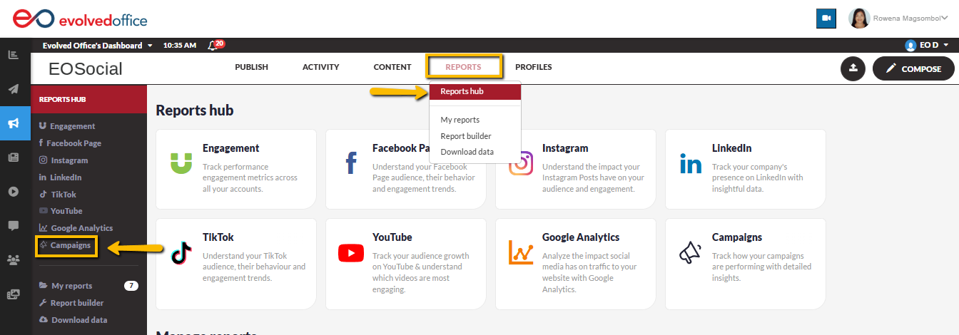 - Find the Campaign Reports in your dashboard under Reports > Reports hub>Campaigns.