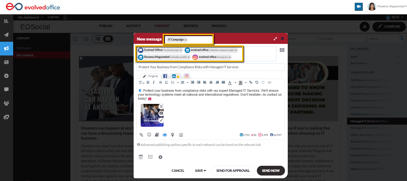 - Choose to send, schedule, save as a draft, or send your posts for approval as usual.