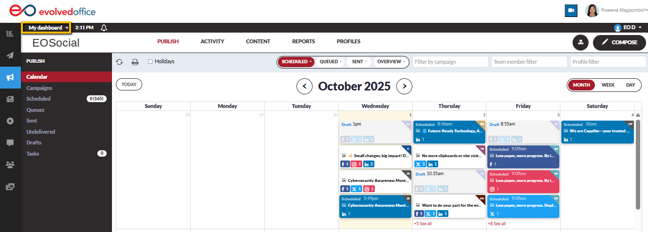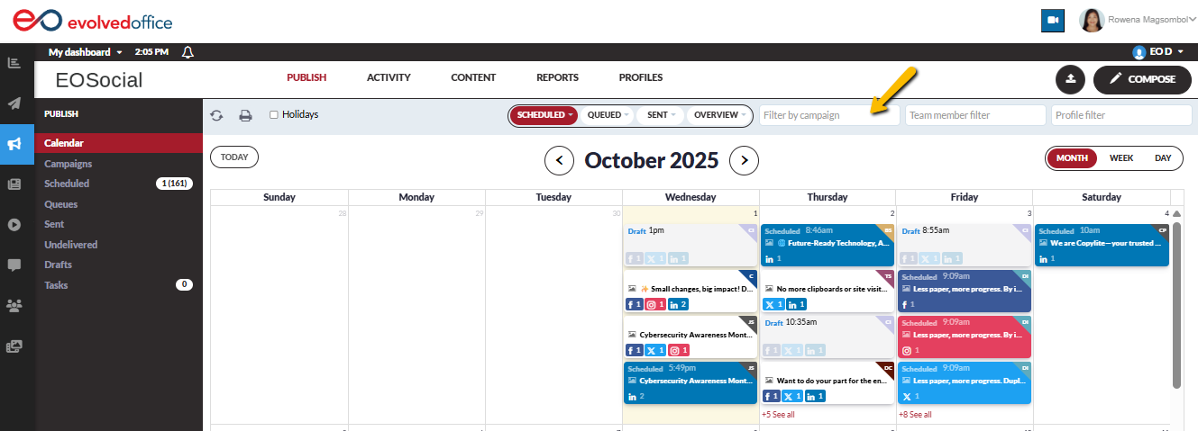 The Calendar view allows you to view your posts by Campaign. From the filter menu, select the Campaign you want to view. The filter also works on the Queued, Sent, and Overview views of the calendar.