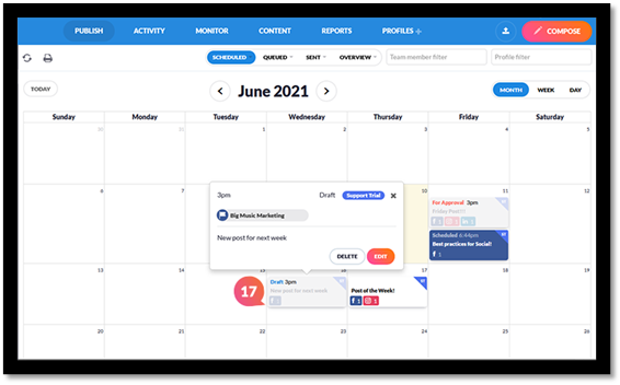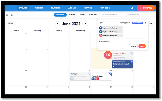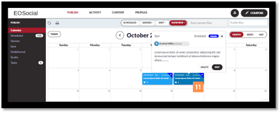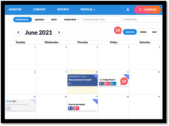 Note: Not all scheduled posts may appear on the calendar, even if they appear on the scheduled view. This is due to a limit of 500 total posts that will be displayed on the calendar at one time.