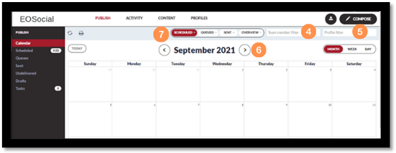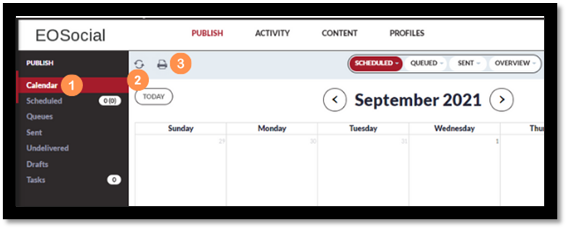 - To access the calendar, select the Publish tab from the top navigation and select calendar from the drop-down. You can also access the Calendar option from the left sidebar when in another area of the Publish section.