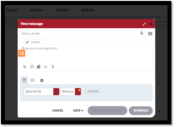 - Clicking on an empty slot in the calendar when viewing Scheduled or Queued messages will prompt the Compose box to be displayed so that you can schedule a message for that day.