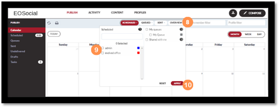 - When you’ve ticked the boxes opposite the user accounts you wish to view scheduled messages for and any Queues you also want to see messages for, select the Apply option and then messages will be displayed in the calendar accordingly.